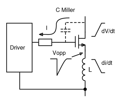 Teoriassa GaN-kytkin on turvallisesti off-asennossa, kun VGS = 0, mutta reaalimaailmassa edes parhaat hilaohjaimet eivät syötä 0 volttia hilalle. Mikä tahansa sarjainduktanssi L lähdepiirissä, joka on yhteinen hilaohjaussilmukalle, synnyttää hilaohjaimelle vastakkaisen jännitteen VOPP, ja tämä voi aiheuttaa virheellisen kytkeytymisen on-tilaan suurella virran nousunopeudella di/dt, koska VOPP = -L di/dt (kuva 1). Sama ilmiö saattaa syntyä, jos off-tilan dV/dt pakottaa virran kulkemaan kytkimen Miller-kapasitanssin läpi, tosin GaN-kytkimen tapauksessa se on yleensä merkityksetöntä.