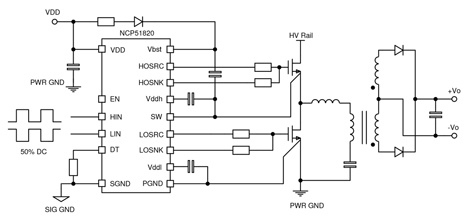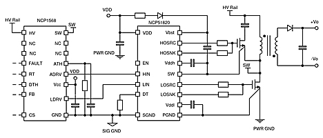 Kuvan 2 piirikaaviossa erityisenä GaN-hilaohjaimena toimii ON Semiconductorin valmistama ohjainpiiri NCP51820 ja muuntimena piiri NCP1568. Ohjainpiiri sisältää vakaan +5,2 voltin amplitudin tuottavat hilaohjaimet sekä yläpuolisen että alapuolisen osan optimoimiseksi avausmuotoista GaN-kytkintä varten.