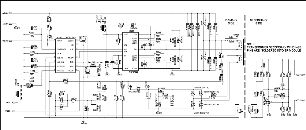 Kuvassa 3 nähdään tyypillinen järjestely, jossa NCP13992-piiri toimii huippuluokan suorituskykyyn yltävänä LLC-ohjaimena. Tällaista rakennetta voidaan käyttää 500 kHz kytkentätaajuudella ja sitä hyödynnetään tyypillisesti suuritehoisten pelikoneiden verkkolaitteissa sekä sulautettuina teholähteinä OLED-televisioissa ja All In One -tyyppisissä PC-koneissa.