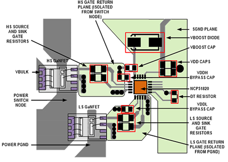 Kaikissa sovelluksissa osien sijoittelu piirilevylle on kriittinen tekijä onnistuneen rakenteen aikaansaamiseksi. Kuvassa 4 nähdään esimerkki asianmukaisesta osien sijoittelusta, kun käytetään NCP15820-piiriä, joka minimoi ja sovittaa hilaohjaussilmukan. GaN-kytkimet ja niiden ohjaimet on sijoitettu samalle puolelle piirilevyä, jotta voidaan välttää liian suurten virtojen kulkeminen läpivientien kautta. Tämä edellyttää myös asianmukaista maatasojen ja paluureittien käyttämistä.