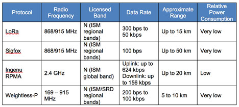 Suosituimpia LPWAN-verkkoja ovat LoRa, Sigfox, Ingenu RPMA ja Weightless. Taulukossa 2 on vertailtu kaikkien neljän avainominaisuuksia.