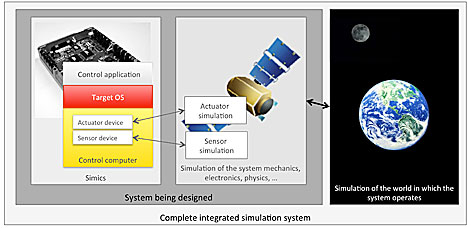 Kuva 1 esittää, kuinka simuloitava kokonaisjärjestelmä jakautuu tietokonelohkoon, ohjattavaan järjestelmään ja ympäristöön. Ohjausohjelmistoa ajavan tietokoneen simulointiohjelmisto, tässä tapauksessa Wind Riverin Simics, on liitetty järjestelmän ja sen ympäristön ohjelmallisiin simulaattoreihin.