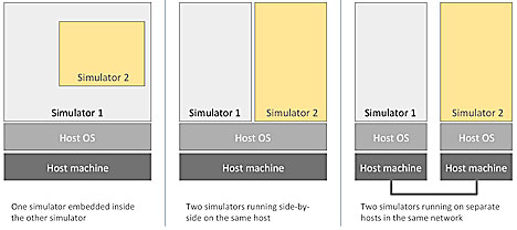 Kun käytetään useita simulaattoreita, jotkut ratkaisut ovat päästä-päähän-tyyppisiä, vaikka isäntä-renki-rakenteet ovatkin paljon yleisempiä, sillä ne voidaan yleensä helpommin liittää jälkikäteen olemassa oleviin simulaattoreihin. Niin kauan kuin valittavalla simulaattorilla on kaikki tarvittavat ominaisuudet ja liitännät, järjestelmän integrointi voidaan suorittaa.