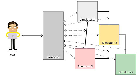 Kuten kuvasta 3 nähdään, etulohko käynnistää integroidut simulaattorit ja liittää ne toisiinsa. Kun simulaattorit ovat toiminnassa, käyttöliittymä voidaan tarjota käyttäjälle tai pitää piilossa. Etulohko voi olla niinkin yksinkertainen kuin komentojonotiedosto, joka käynnistää kaikki simulaattorit yhden konfiguraation perusteella. Toisaalta se voi yhtä hyvin olla täysimittainen räätälöity graafinen sovellus, joka huolehtii simuloinnin ajamisesta, kerää tulokset ja antaa käyttäjälle mahdollisuuden järjestelmän konfigurointiin.