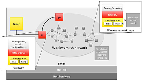 Kuvan 4 mukaisessa simulaattorissa laajan verkon luominen voi olla erittäin helppoa. Tarvitaan vain kirjoitettu ohjelma, joka virtuaalisesti asentaa ja levittää solmut yli tarvittavan virtuaalitilan ja sen jälkeen mallintaa solmujen väliset langattomat yhteydet. Kukin solmu, yhdyskäytävä tai palvelin ajaa samaa ohjelmistopinoa kuin se tekisi myös reaalimaailmassa, ja ympäröivän maailman simulaattorit kytkeytyvät antureihin ja toimilaitteisiin sekä simuloivat langattoman verkon fyysisiä reaalitoimintoja.