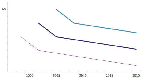 Kuva 3. Kustannukset 80, 130 ja 65 nanometrin (ylimpänä) prosesseissa vuosien varrella. Hinta laskee tasaisesti ajan kuluessa (kuva: IMEC ic-link).