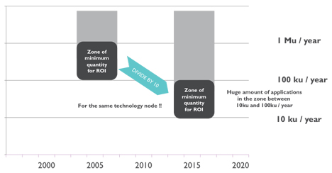 Kuva 5. Räätälöidyn SoC-piirin investoinnin edellyttämät minimituotantomäärät. 180 nanometrissä tämänhetkisillä kustannuksilla muutama tuhatta kappaletta vuodessa on minimivaatimus (IMEC ic-linkin mukaan).