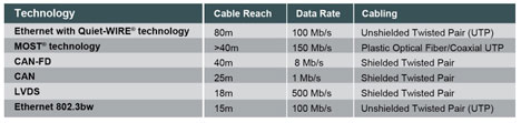 Itsenäisesti toimivien ajoneuvojen eri video-, ääni-, anturi- ja telemaattisten alijärjestelmien liittämiseksi toisiinsa on tällä hetkellä useita vaihtoehtoja, joista CAN, CAN-FD, LVDS, MOST ja Ethernet ovat tärkeimmät. Kuten aiemmin todettiin, kunkin tekniikan sallima pisin kaapeliyhteys ja datansiirron kaistanleveys on otettava huomioon hyötyajoneuvojen valtavan koon vuoksi.