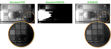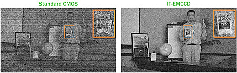 Kuvassa 1 demonstroidaan tekniikan suorituskykyä. Molemmat kuvat on otettu samoissa olosuhteissa 0,01 luksin valossa, mikä vastaa kuunsirpin valoa kirkkaana yönä. Standardilla CMOS-kuva-anturilla otetun kuvan yksityiskohdat hämärtyvät anturin tauskohinassa, mikä on hyvin yleistä alhaisilla valovoimakkuuksilla. Sen sijaan IT-EMCCD-kuva tallentaa paljon enemmän yksityiskohtia jopa tätä heikommissa valaistusoloissa.