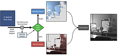 Tämä laajemman dynamiikan IT-EMCCD-kennoissa mahdolistaa näkymien välinen kytkettävä vahvistus (intra-scene switchable gain). Tekniikka mahdollistaa yksittäisten pikselien varauksen lähettämisen joko standardina CCD-lähtösignaalina tai elektronit monikertaistavana lähtönä pikseli pikseliltä. Kun kuva-anturimatriisia luetaan (kuva 3), jokaisen pikselin varaus kulkee anturiosan läpi, jossa varauksen koko mitataan ilman, että se vaikuttaa varaukseen. Tämän informaation kameran ohjauselektroniikka voi lukea, jolloin saadaan alustava signaalintason mittaus jokaiselle yksittäiselle pikselille. Käytännössä pikselit ”tagataan” kirkkaiksi tai tummiksi. Tätä informaatiota voidaan sitten käyttää ajamaan kennon kytkintä, joka ohjaa varauspaketit jompaankumpaan lähtöön signaalitason perusteella.