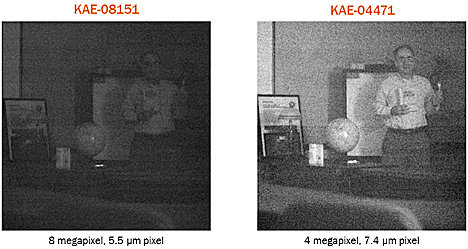 Kuva 4: KAE-08151- (5,5 µm pikseli) ja KAE-04471-kennojen (7,4 µm pikseli) kuvat. Molemmat kuvat on otettu 0,1 luksin valovoimassa f1.4-linssillä 81,5 millisekunnin valotusajalla.