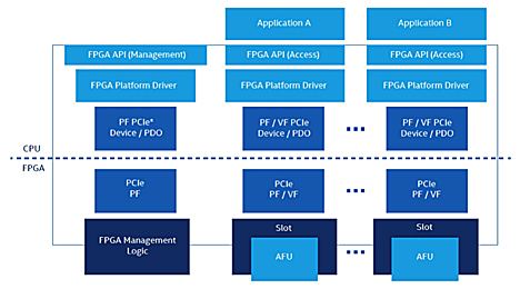 Kuvan 1 mukainen kokonaisvaltainen järjestelmäpino on lähestymistapa, jota tarvitaan aikaansaamaan kerrostettu yhteysmalli FPGA:n kiihdyttämisessä eri laitteissa, käyttöjärjestelmissä ja sovelluskohteissa. FPGA:n toteuttamisessa tarvitaan tällöin ajureita, käyttäjätilan API-liittymiä, sovelluskehyksiä ja sovelluskohtaisia kirjastoja.