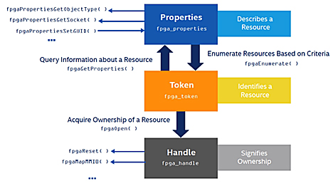 OPAE C API on mallinnettu kokoelmasta perusobjekteja, joilla kuvataan, identifioidaan ja referoidaan FPGA-resursseja. On syytä korostaa, että tässä kuvatut API:t muodostavat peruspaketin, joka on sovitettavissa useimpiin ohjelmistojärjestelmiin liitettäviin FPGA-kiihdyttimiin. API:n avulla voidaan myös mallintaa laitteisto- tai alustaspesifisiin laajennuksiin erityisiä kohdearkkitehtuurien erityisominaisuuksia. Esimerkkinä voidaan mainita alustaspesifinen API-laajennus, joka toimii pieniviiveisenä ilmoitusmekanismina Intelin Xeon-prosessorin yhtenäisen muistiväylän ja integroitujen FPGA-piirien välillä.