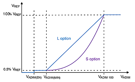 Usein PWM-pohjainen himmennysominaisuus saattaa aiheuttaa lähtöön sähköistä häiriötä ja välkyntää, kun PWM on johtamattomassa toimintatilassa, mutta käytettäessä NCL30386-piiriä lähtö on aina muunnettu analogiatasolle riippumatta siitä, onko himmennys toteutettu analogiatulolla vai PWM-signaalilla. NCL30386 tukee himmennystasoja nollasta sataan prosenttiin käytettäessä PWM:ää ja 0,5:stä sataan prosenttiin käytettäessä analogiatuloa. Kuvassa 3 on esitetty lähtöä kuvaavat käyrät lineaariselle ja neliömuotoiselle NCL30386-versiolle.