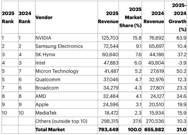 Nvidian liikevaihto kasvoi vuodessa lähes 49 miljardia dollaria. Yhtiö vastasi yli kolmanneksesta koko alan kasvusta. Gartnerin mukaan Nvidia ohitti Samsung Electronicsin 53 miljardilla dollarilla ja kasvatti markkinaosuutensa 15,8 prosenttiin.