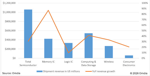 Puolijohdeteollisuus ylittää ensimmäistä kertaa biljoonan dollarin liikevaihdon rajan vuonna 2026. Taustalla on ennen kaikkea tekoälyn räjähdysmäinen kasvu, joka ohjaa investointeja muisti- ja logiikkapiireihin sekä datakeskuksiin, arvioi Omdia tuoreessa markkinaennusteessaan.