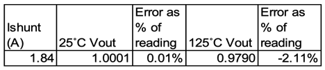 Operaatiovahvistinta MCP6V76 hyödyntävällä testauskortilla tallennettiin taulukossa nähtävät lämpötilaryöminnän arvot välillä 25°C – 125°C. Virheet pysyivät samalla tasolla yli sataan asteeseen, ja suuren osan virheestä 125 asteen lämpötilassa voidaan tulkita johtuvan muiden komponenttien, kuten perinteisen vahvistusvastuksen ja vahvistimen, ryömimisestä.