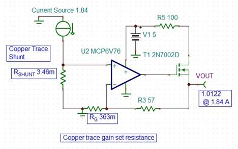 Kuva 1. Peruspiiri alemman puolen virtamittausta varten. Siinä hyödynnetään piirilevyn kupariliuskoista muodostettua lämpötilakompensoitua shunttivastusta.