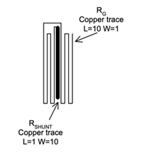Koska vahvistusvastuksen on tarkoitus lämpökompensoida suurivirtaista polkua RSHUNT, se tulisi sijoittaa symmetrisesti ja lähelle RSHUNT-elementtiä. Kuvassa 2 nähdään periaatekaavio shunttina toimivan kuparisen piirilevyjohtimen ja vahvistuskertoimen määrittävän johdinliuskan suhdesovituksesta perusvirheiden sekä lämpötilavirheiden minimoimiseksi. Vastusliuskojen sijoittelussa hyödynnetään liuskojen mittasuhteita ja lomittelua.