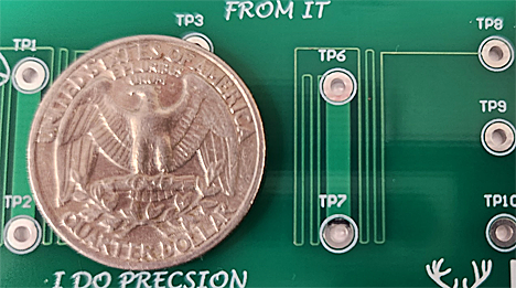 Kuva 3. Lähikuva testilevystä, jolle on asetettu myös kolikko todellisen koon mittapuuksi. Pisteiden TP6 ja TP7 välillä kulkeva johdinliuska on shunttivastus RSHUNT. Vastaavasti pisteiden TP6 ja TP8 välinen kuparijohdin muodostaa vahvistusvastuksen RG. Kolikon alle jäävässä osassa on samanlainen käyttämätön piiri.