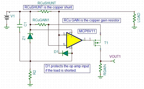 Virtaohjauspiiri soveltuu hyvin johdinliuskojen kompensointimenettelyyn, jossa RCuSHUNT ja RCuGAIN1 ovat piirilevyn kupariliuskoja. RG on tavanomainen vastus, jonka resistanssiarvo valitaan halutun vahvistuksen mukaisesti. Zenerdiodi Z1 toimii operaatiovahvistimen koko syöttöjännitteen (rail-to-rail) regulaattorina. Diodi D1 suojaa tuloastetta kuorman mahdollisen oikosulun varalta.