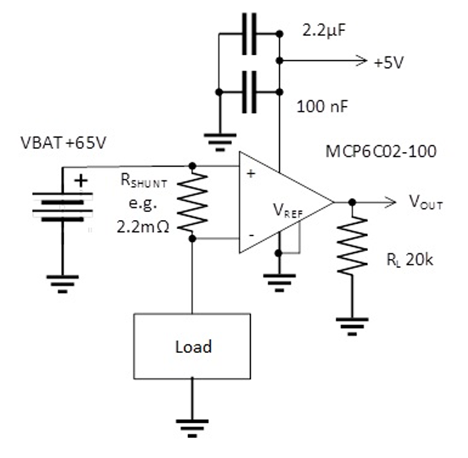 Kuva 5. Erillistä shunttivastusta hyödyntävän virtamittauksen vahvistinkytkentä, jossa käytetään Microchipin mittausvahvistinta MCP6C02-100.
