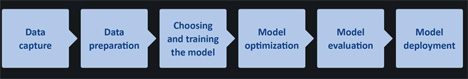 Virheettömien reaaliaikaisten syötetietojen ja datajoukon hankkiminen, datan valmistelu ja mallin kouluttaminen muodostavat kolme ensimmäistä vaihetta kuvassa 1. Mallin optimointi (vaihe 4) on tyypillisesti datan pakkaamista, joka auttaa vähentämään muistivaatimuksia (RAM prosessoinnin aikana ja NVM tallennuksessa) sekä lyhentämään datankäsittelyn latenssia.