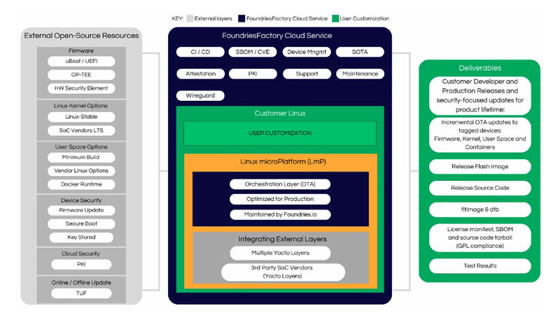 Mainitut toiminnot muodostavat järjestelmällisen lähestymistavan kirjata, tallentaa ja hallita dataa yksikkökohtaisesti ja kokonaisuutena alkaen suunnittelusta tuotannon kautta aina toimituksen jälkeiseen ylläpitoon asti. Koska nämä kaikki toiminnot vahvistavat CRA-yhdenmukaisuutta, EU-säädöksen voimaantulo vauhdittaa laitevalmistajien halua ottaa käyttöön formaalinen DevOps-kehitysympäristö, josta esimerkkinä on Foundries.io:n tyyppinen FoundriesFactory-alusta (katso kuva 3).