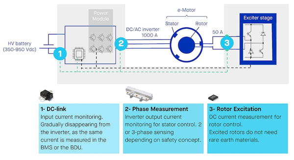 - Sähkömoottorissa invertterin lähtövirralla ohjataan jokaista moottorin vaihetta siten, että saadaan aikaan pyörivä magneettikenttä moottorin pyörittämistä varten. Invertterin virralla ohjataan moottorin vääntömomenttia ja nopeutta säätämällä jokaiseen vaiheeseen syötettävän virran taajuutta ja amplitudia. Tähän tehtävään tarvitaan virta-antureita. Laitevalmistajan turvallisuusnäkökohdista riippuen voidaan tässä käyttää kaksi- tai kolmevaiheisia anturikomponentteja. Tilan ja kustannusten säästämisessä auttaa mekaaninen integraatio. LEM:n valikoimassa on tarjolla HAH2 kaksivaiheisiin ja HAH3 kolmevaiheisiin virta-antureihin asiakaskohtaisten piirien lisäksi.