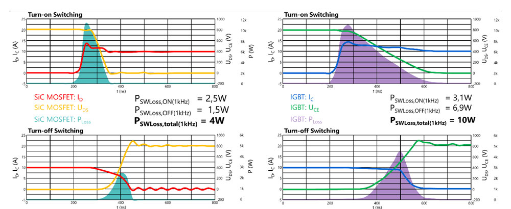 SiC-mosfetilla on huomattavasti nopeampi sammutus ja lyhyempi häntävirta, joten se voi IGBT:n korvatessaan vähentää häviöitä jopa yli 60%. Käynnistyshäviöitä voidaan puolestaan vähentää yli 50 prosenttia (kuva 1). Johtumis- ja diodihäviöiden osalta etuja saavutetaan osittaisen kuorman olosuhteissa. Muutoin johtumishäviöt ovat pieniä verrattuna käynnistys- ja sammutushäviöihin.