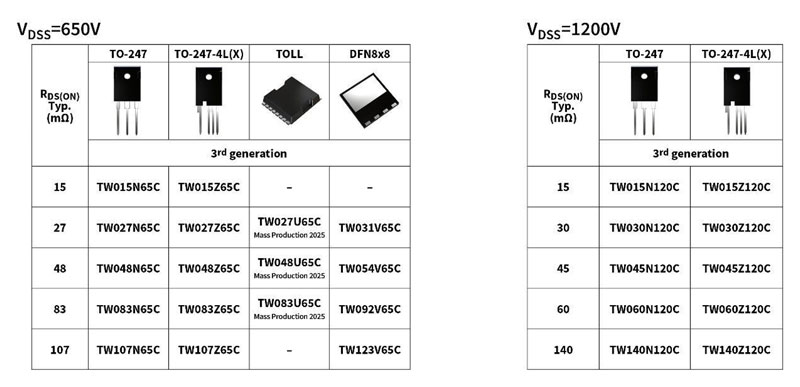 Kuva 3. Saatavilla olevat Toshiban kolmannen sukupolven SiC-mosfetit, joiden VDSS on 650 V tai 1200 V (massatuotanto alkanut tänä vuonna).