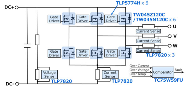 Myös moottorin vaiheiden (U, V, W) viantunnistus, ylivirta- ja ylijännitetilanteiden tunnistus sekä ylilämpötilan valvonta komparaattorilla TC75W95FU on integroitu mukaan invertteriin (kuva 5). Kumpikin kortti toimii 20 voltin ohjausjännitteellä, ja invertteriä voidaan jäähdyttää konvektion tai paineilman avulla.