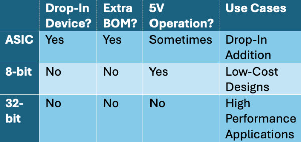 Laskennan kannalta intensiivisissä sovelluksissa kannattaa harkita 32-bittisiä mikro-ohjaimia, jotka ovat tehokkaampia ja sisältävät enemmän käytettävissä olevaa muistia. 32-bittiset mikro-ohjaimet voivat kuitenkin olla kalliita, suurikokoisia ja käyttöjännitteeltään rajallisia. Oheisessa taulukossa on vertailtu eri lähestymistapojen etuja ja haittoja.