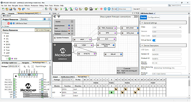 Seuraavat esimerkit ovat yksinkertaisia sovelluksia, jotka on kehitetty AVR DU -piireille. Näissä esimerkeissä on käytetty MPLAB-kehityspakettiin kuuluvaa ilmaista MCC-työkalua (MPLAB Code Configurator), joka konfiguroi ja luo sovelluksen API-ohjelmointirajapinnan oheislohkoille mukana tulevan USB Stack Libraryn avulla. Kirjasto tukee natiivisti CDC- (Communications Device Class) ja HID-laitteita (Human Interface Device) kuten näppäimistöjä ja hiiriä.
