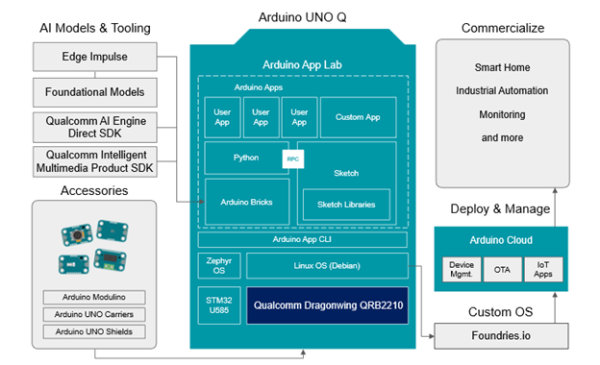 Arduino tunnetaan suunnittelijoiden, ammattilaisten, tekijöiden, opettajien ja opiskelijoiden valtavasta yhteisöstä. Suosion taustalla ovat hyvin suunnitellut ja helppokäyttöiset kortit sekä suosittu Arduino IDE, jonka haltuunotto käy nopeasti. UNO Q tuo nämä vahvuudet alustaan, joka perustuu Qualcomm Dragonwing QRB2210 -prosessoriin. Se tarjoaa Arduino-käyttäjille suuren harppauksen datankäsittelyssä, AI-inferenssissä, tallennuksessa ja liitettävyydessä. Reaaliaikatoiminnot puolestaan hoitaa kortille integroitu STM32U585-mikro-ohjain.