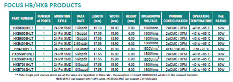 HbxxxxHLT-sarja kattaa massamarkkinoiden lämpötila-alueen 0–70 °C. HXBxxxxHLT-sarja on suunniteltu teollisuus- ja ulkoilmasovelluksiin, joissa lämpötila-alue vaihtelee välillä –40…+85 °C. Lisäksi HB/HXB-sarjat tukevat PoE-siirtotekniikkaa ja mahdollistavat enintään 90 W tasavirran 4-parisia Ethernet-kaapeleita pitkin.