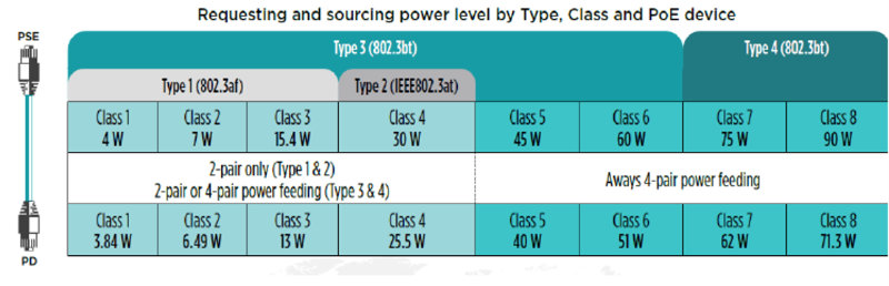 Alun perin oli olemassa kaksi kahdella johdinparilla varustettua PoE-vaihtoehtoa. Tehonsyötön tyyppi on riippuvainen siitä, minkä tyyppinen yhteys on kysymyksessä. A-muodossa tehonsyöttö ja signaali on yhdistetty, ja B-muodossa tehonsyöttö ja signaali on erotettu toisistaan. Nykyään painopiste on ratkaisuissa, joissa käytössä on neljä tyypin 3 (suuritehoinen, 60 W) ja tyypin 4 (suuritehoinen, 90 W) johdinparia, mikä on lisännyt kaikkien yhteyksien kuormituskapasiteettia (kuva 2).