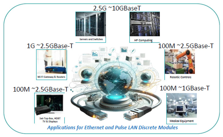 Pulsen kaikki erilliset LAN-tuotteet on suunniteltu toimimaan eri valmistajien toimittamien PHY-piirien kanssa halutuilla Ethernet-datanopeuksilla 10Base-T:stä (10 Mb/s) 10GBase-T:hen (10 Gb/s) saakka. Sopivan komponentin valinta on ratkaiseva asia, sillä moduulin tulee tukea Ethernet-datansiirtoa muuntajan läpi ilman, että ilmenee viiveitä, vääristymiä tai ylimääräisiä EMI/EMC-häiriöitä.