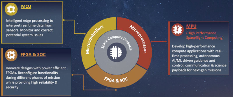 Uudet suurteholaskentaan tarkoitetut mikroprosessorit ovat osa uuden innovaatioekosysteemin avaruusluokan prosessointipiirien kolmikkoa. Tähän kolmikkoon kuuluvat prosessorien lisäksi älykästä reunalaskentaa suorittavat mikro-ohjaimet (MCU) sekä FPGA-piirit ja SoC-järjestelmäpiirit, jotka tarjoavat uudelleenkonfiguroitavaa toiminnallisuutta eri tehtävävaiheissa sekä korkean tason luotettavuutta ja turvallisuutta (kuva 1).